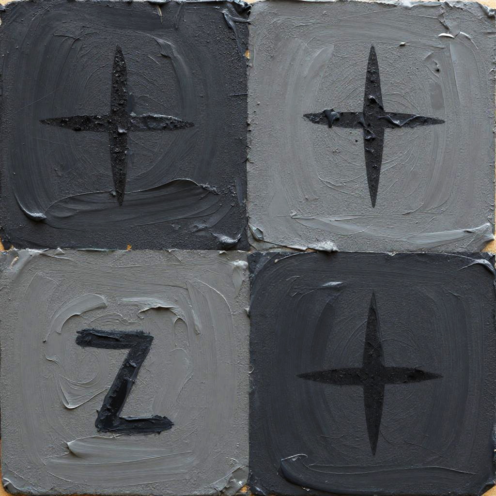 This is a photograph of a four-square canvas painting, each square featuring thick, textured layers of dark and light blue-gray paint. The top-left and bottom-right squares display large, black, star-like symbols centered within them. The top-right and bottom-left squares contain bold, black letters "Z" and "7" respectively, also centered. The paint has a rough, brushed texture, with visible ridges and uneven edges, giving the artwork a dynamic, tactile quality. The overall composition is simple yet striking, with contrasting colors and bold symbols creating a sense of depth and visual interest.