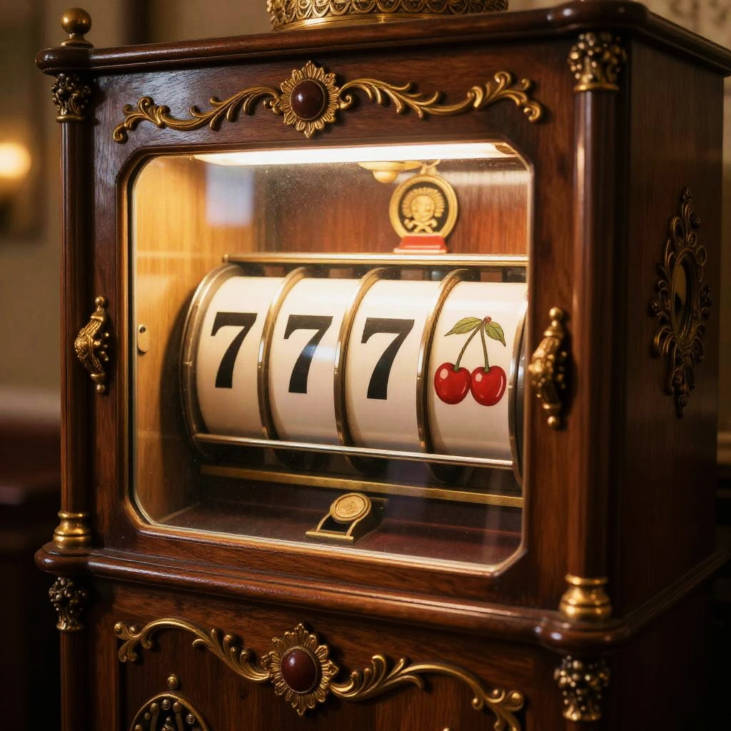 Close-up of a vintage spielautomaten machine with wooden panels, ornate golden details, glowing reels displaying lucky sevens and cherries, warm lighting, nostalgic atmosphere, intricate craftsmanship, realism blended with fantasy elements.