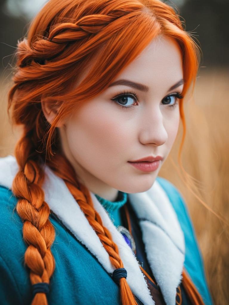 Photo-realistic portrait of a young woman cosplaying Anna from the movie Frozen. She has striking orange-red hair styled in twin braids, blue eyes, and fair skin. She is wearing a light blue costume with snowflake patterns and dark blue accents resembling Anna's outfit. The background is softly blurred with natural light and a wintery snowy setting, highlighting the vibrant colors and realistic texture of the costume and hair.