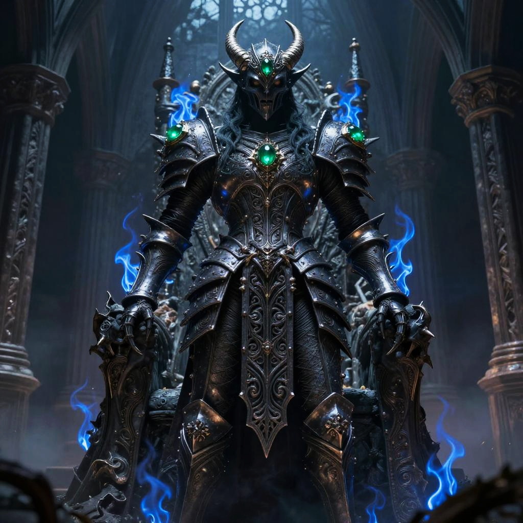 Demonic armor standing in a ruined gothic throne room, emeralds embedded in the shoulders glowing faintly, intricate filigree intertwined with sinister motifs, eerie blue flames flickering around the edges, supernatural atmosphere with dramatic shadows and mist.