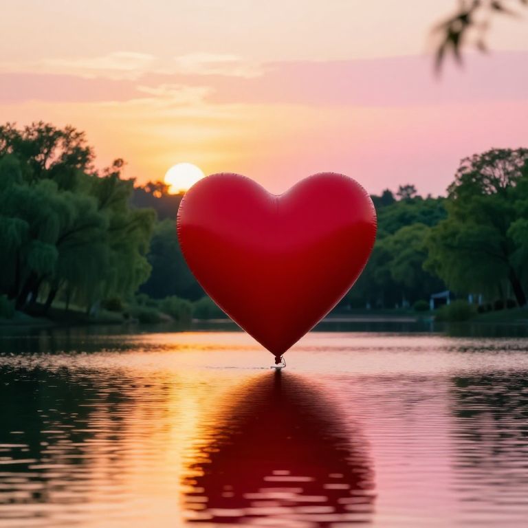 Baloon in the shape of a giant red heart drifting over a serene lake at sunset, reflecting golden and pink hues on the water, surrounded by lush green trees, creating a peaceful, romantic mood in a natural landscape.