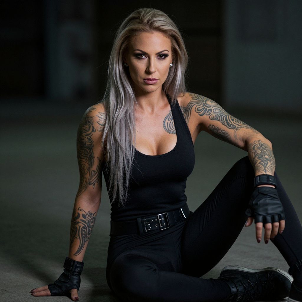 Photograph of a fit, white woman with long, straight, silver-blonde hair sitting on a dark floor in a dimly lit room. She has extensive black and grey tattoos on both arms and wears a black tank top with a wide belt, black pants, and fingerless gloves. Her makeup is bold with dark eyeliner and pink lipstick. She gazes directly at the camera with a confident expression. The background is blurred, emphasizing her as the focal point. The lighting highlights her tattoos and muscular build, creating a dramatic, edgy atmosphere.