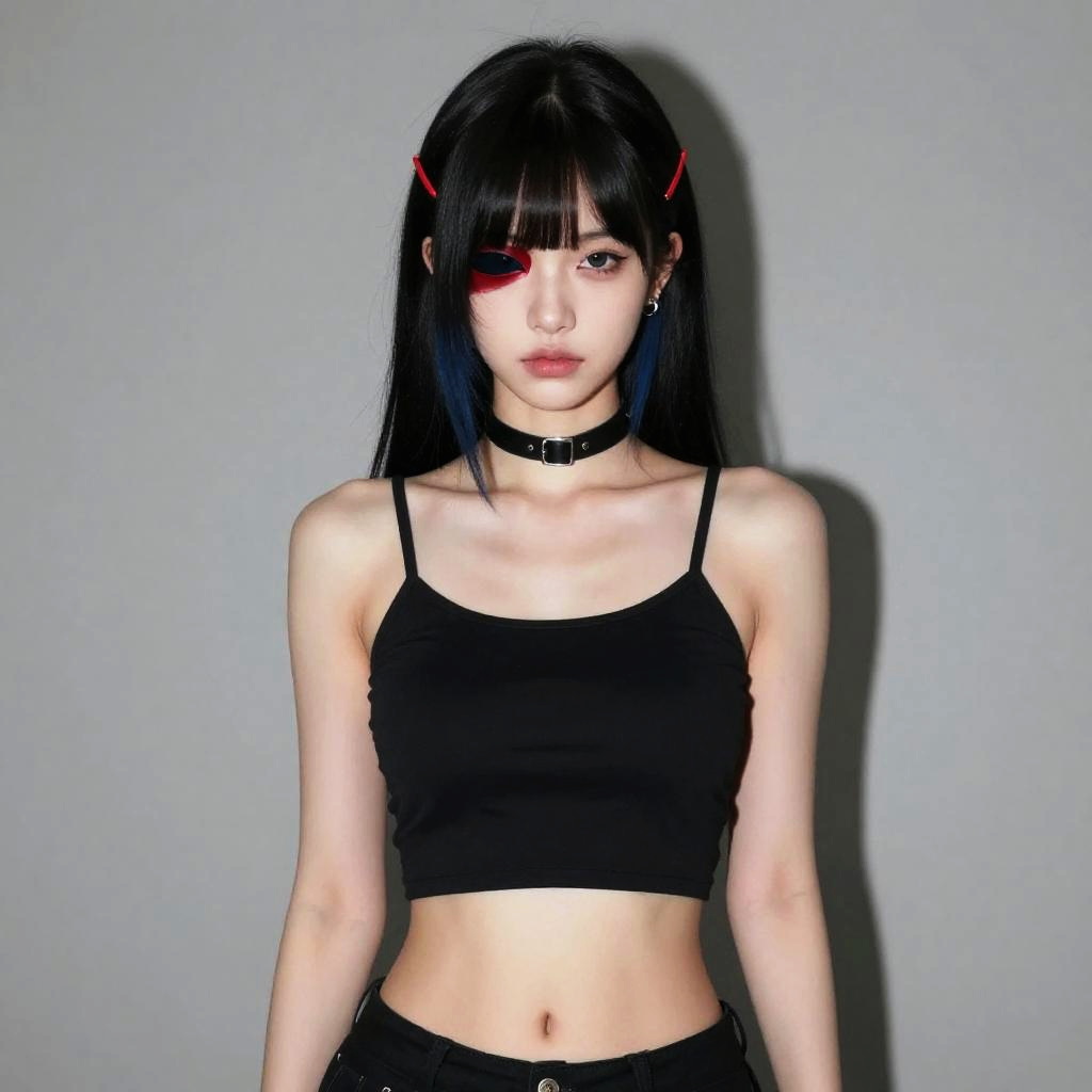 Photograph of a young woman with long, straight black hair and bangs, wearing a black eye patch over her right eye. She has pale skin and wears a black choker necklace, a black cropped tank top revealing her midriff, and black pants. A red hair clip is on her left side. She has a tattoo of a woman's face with dark hair on her right hip. The background is a plain, solid gray. The image has a slightly digital, stylized appearance, with a soft shadow cast behind her.