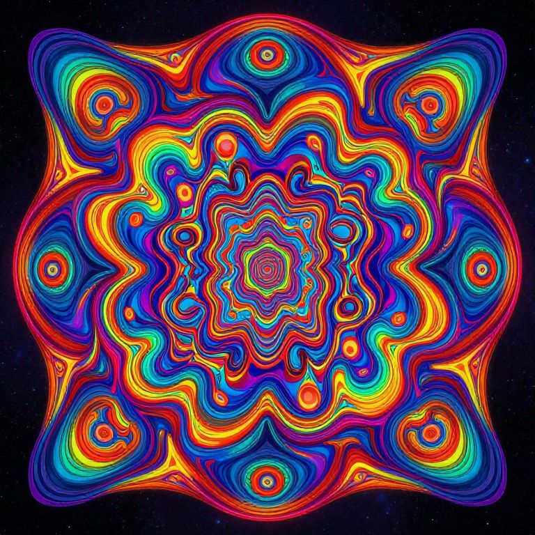 Cool psychedelic art featuring abstract fluid shapes morphing organically in a kaleidoscope of intense rainbow hues, hypnotic spirals and repeating motifs creating a mesmerizing visual effect, set against a dark starry background, high detail, vivid contrast.