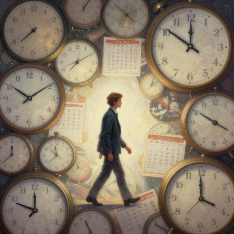 Overlap in time, a surreal depiction of clocks and calendars blended together with a person walking through layers of different historical eras, soft glowing light, painterly style with rich textures and dynamic composition, evoking a sense of memory and continuity.