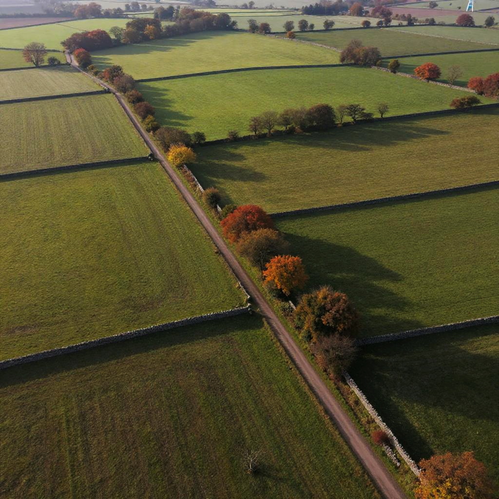Aerial view of Farr countryside fields in patchwork patterns, winding dirt roads and stone walls dividing lush farmland, early autumn colors with hints of orange and yellow, soft diffused sunlight casting gentle shadows, photorealistic drone perspective.