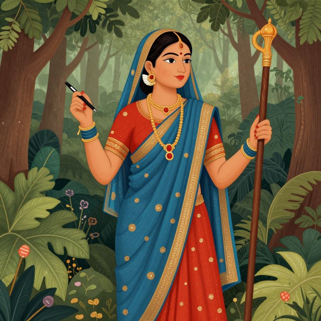 Digital illustration of a traditional Indian woman in a red and blue saree, holding a pen and staff, standing in a lush forest. She wears jewelry