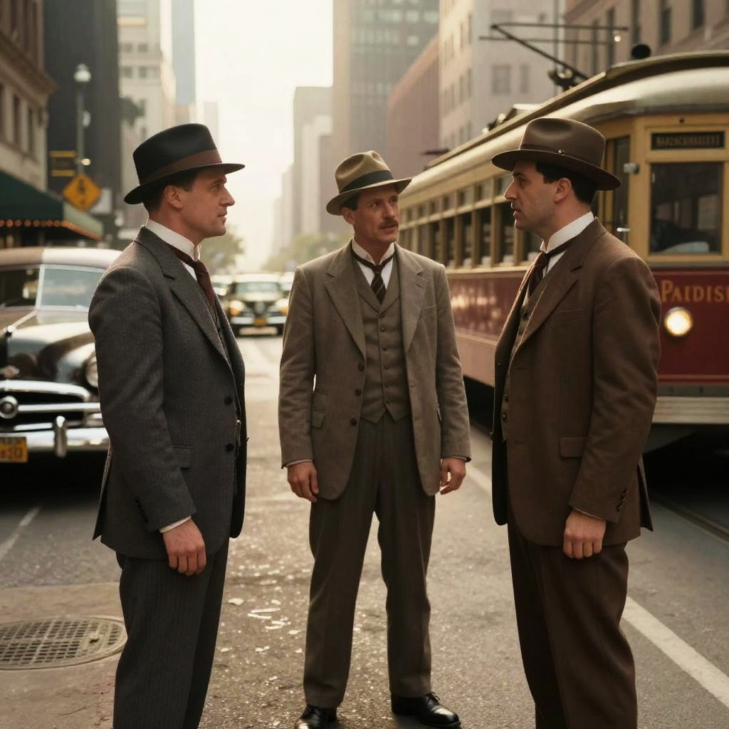 1920s New York gangsters in pinstripe suits, standing confidently outside a classic jazz club, neon signs glowing, rain-soaked cobblestone streets, atmospheric cityscape