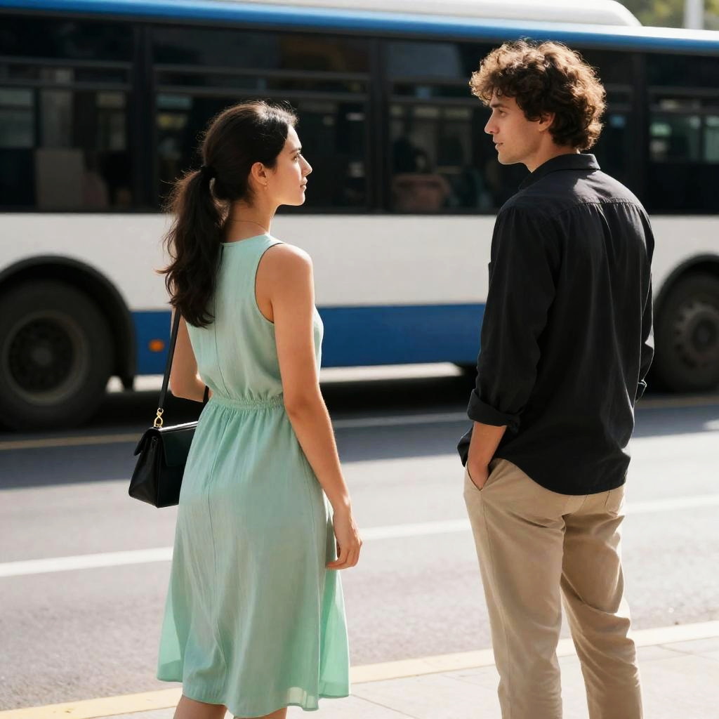 Photograph of a man and woman sitting in a dimly lit theater. Man has curly brown hair, light blue shirt, holds hands together. Woman has short dark hair, black top, gazes at man. Blue light from screen above. Blurred theater seats in background. Man looks focused, woman's expression neutral. Both facing each other.