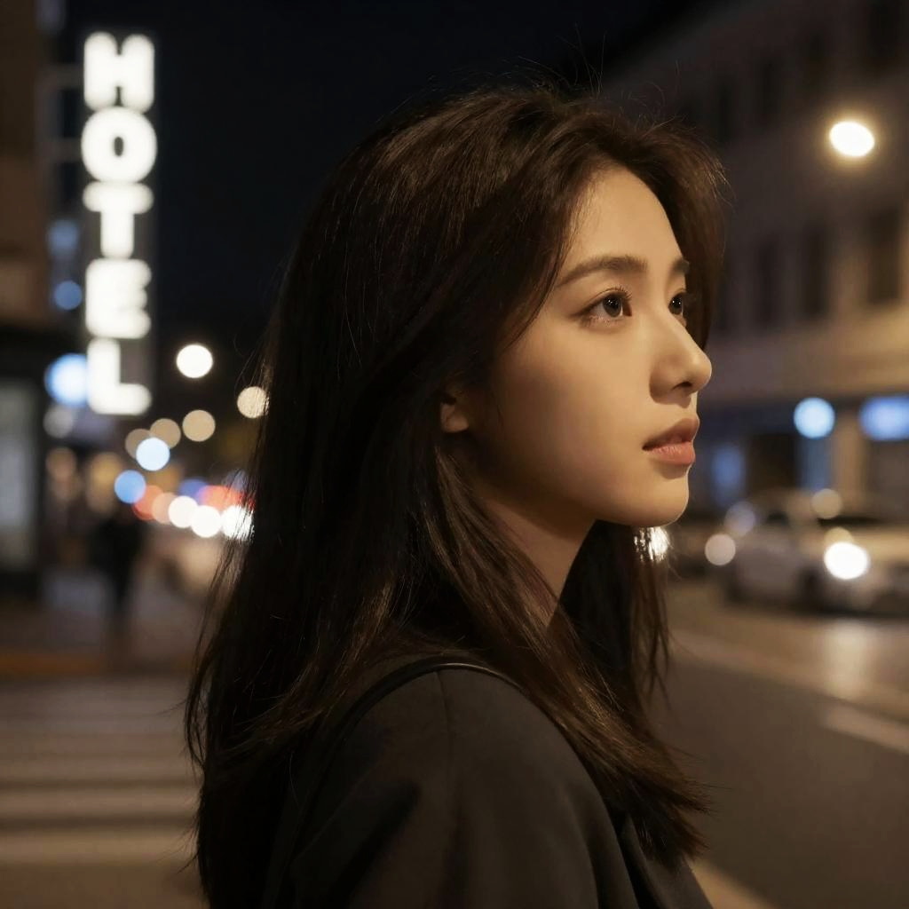 Photograph of a young woman with long dark brown hair, side profile, looking to the right. She wears a dark top. Background: blurry hotel sign with "HOTEL" in lights, bokeh lights, and urban street scene. Nighttime setting.