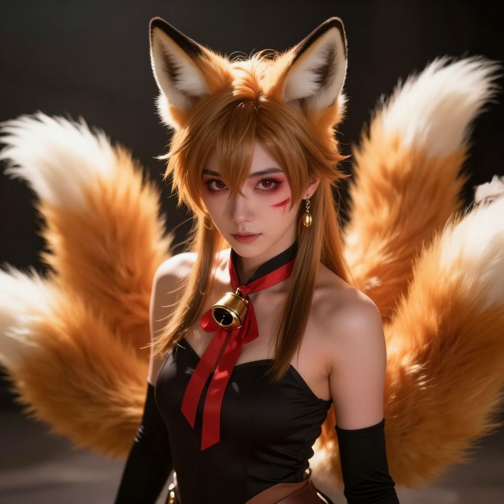 (masterpiece, best-quality:1.3), (((epic-Ultra-HD-details, epic-Ultra-HD-detailed, epic-Ultra-HD-highlights, epic-Ultra-HD-realistic, photorealistic, upscaled-resolution, optimal, optimal-lighting, dramatic-shadows, glow-of-life, multi-layer-lighting, main-attention))), (kosaka1st, medium hair, facial mark, red eyeshadow, forehead mark, makeup, fox ears, animal ear fluff, fox tail, multiple tails), (single earring, black gloves, neck ribbon, neck bell, leotard)