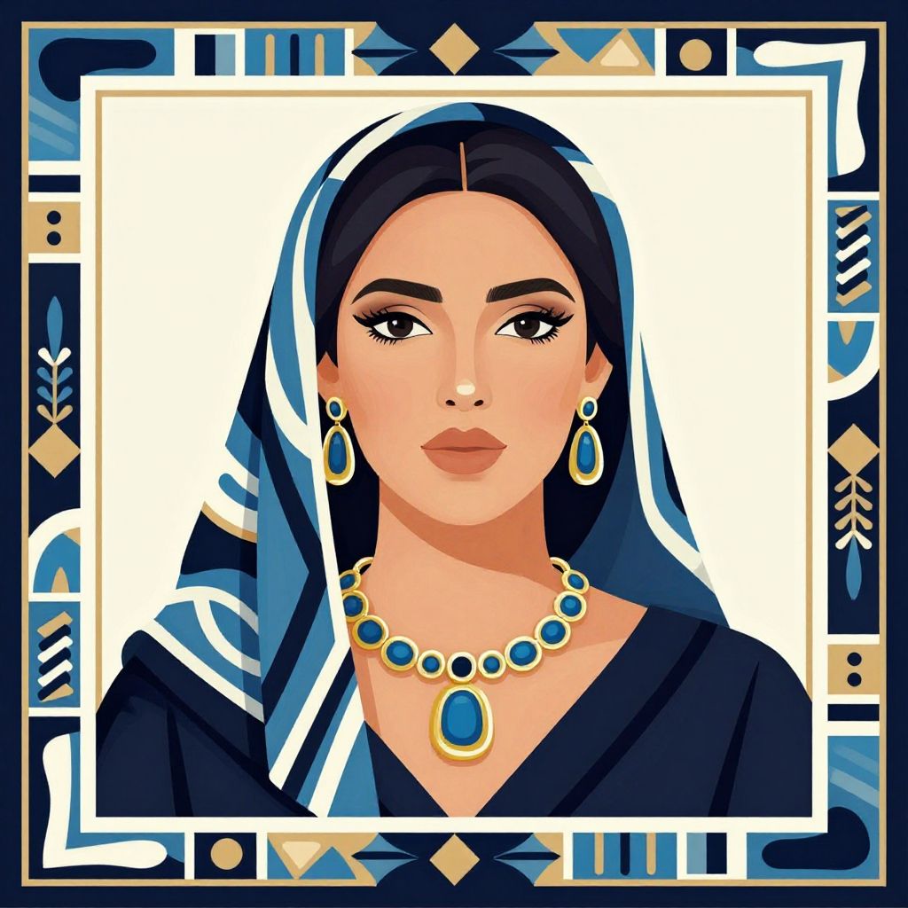 Graphic illustration of an elegant woman wearing a patterned headscarf and matching necklace with blue, black, white, and gold colors. The portrait is framed by a decorative border featuring geometric and abstract designs in coordinating colors.