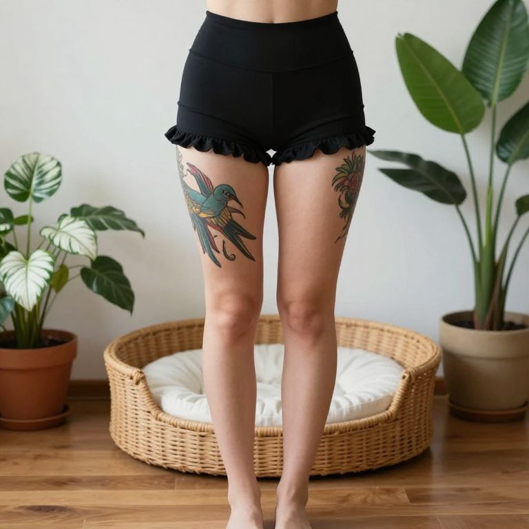 Photograph of a tattooed person standing on a wooden floor, showing their lower body from the waist down. They're wearing black, high-waisted shorts with a ruffled hem. Their left thigh features a large, colorful tattoo of a bird. In the background, there are several potted plants, including a large leafy one to the right and a smaller plant with white leaves to the left. A round, wicker dog bed with a white cushion is on the floor near their feet.
