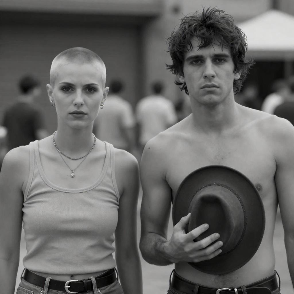Black-and-White Duo: Shaved-Head Woman and Shirtless Man
