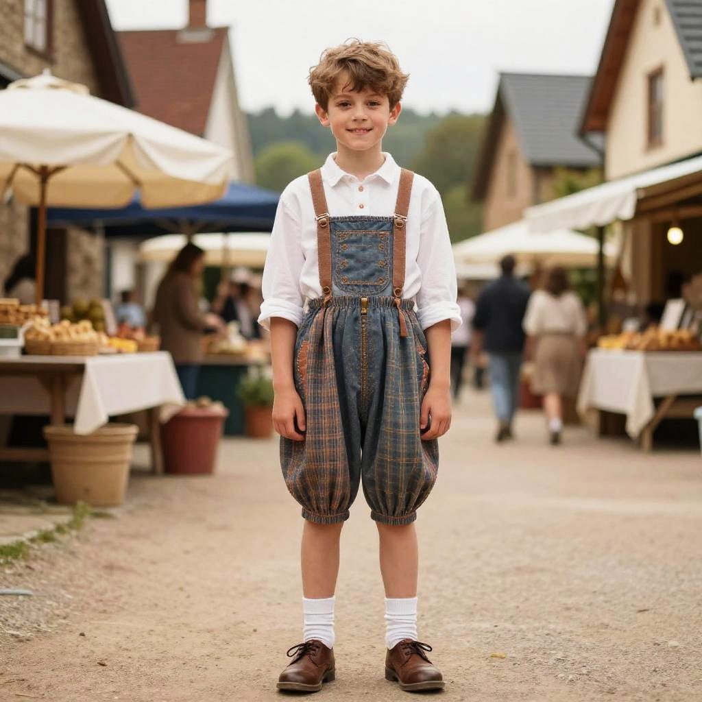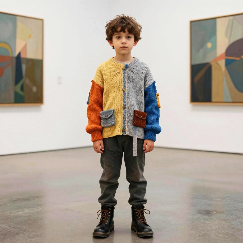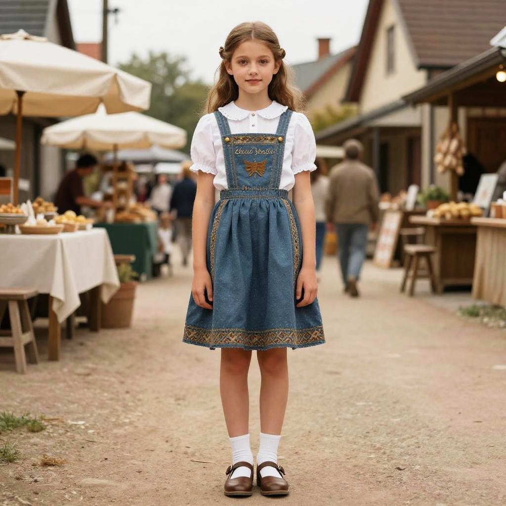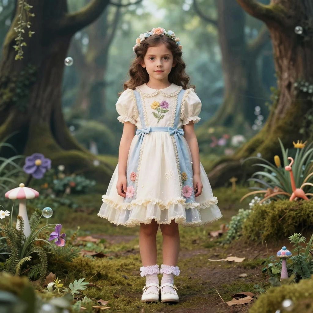 Full-length fashion-forward portrayal of a child girl in fairytale inspired dresses styled by Lotta Volkova, standing in an enchanted forest clearing, with magical and playful styling.