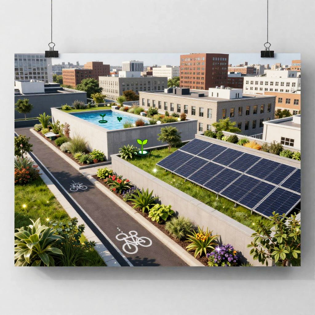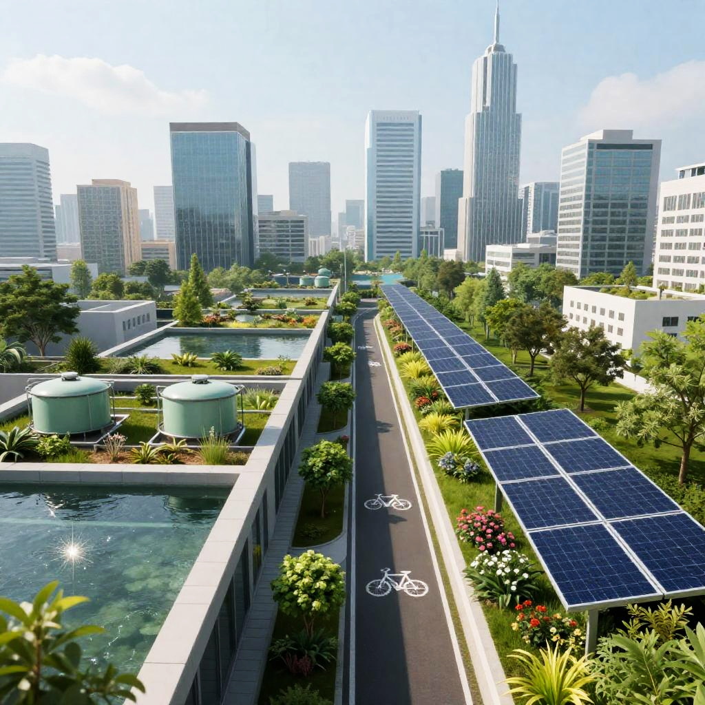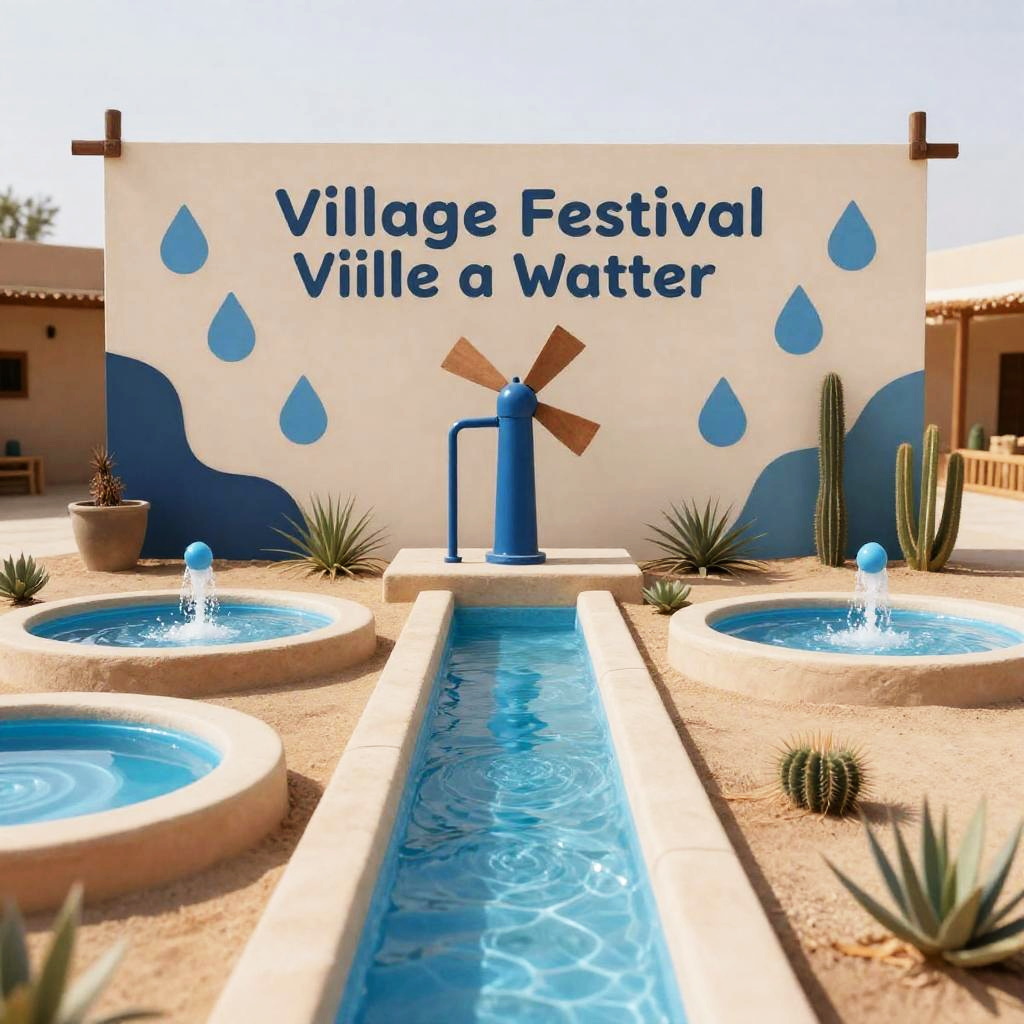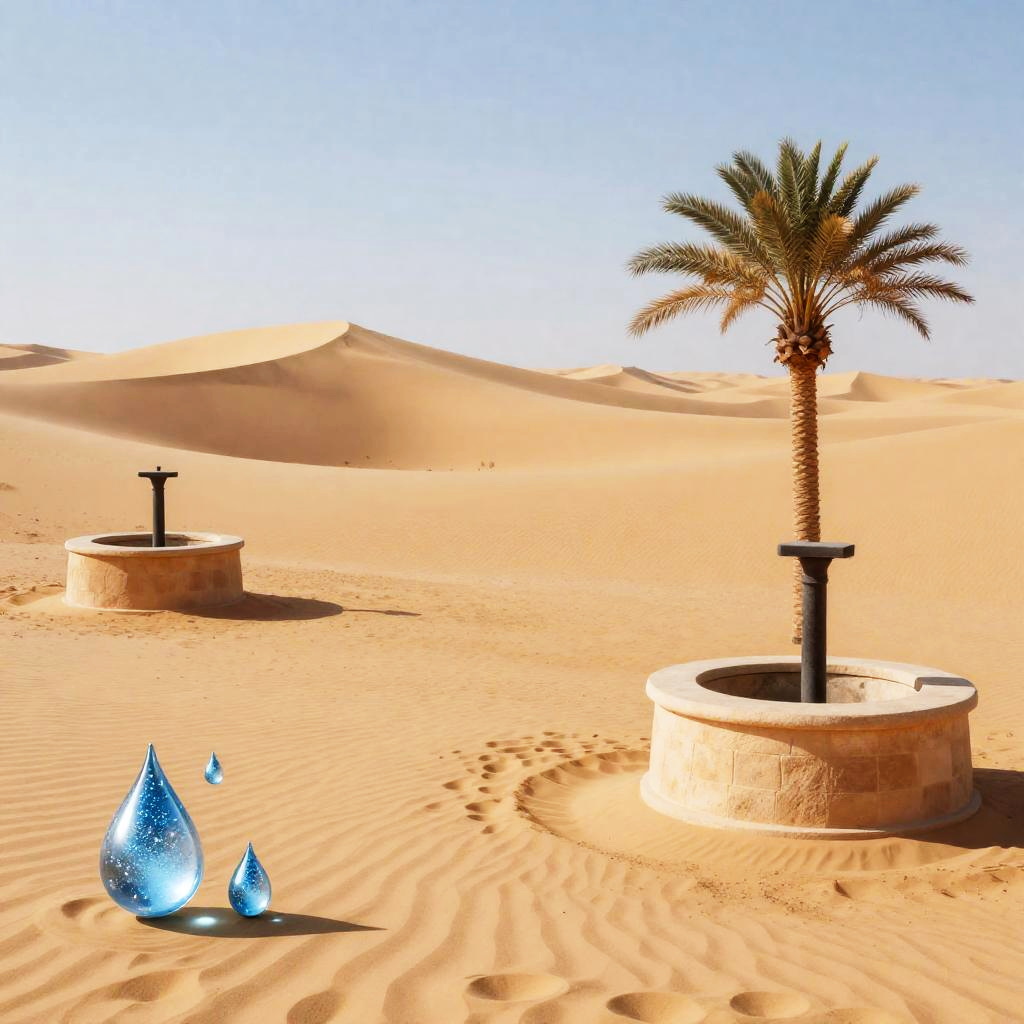 Create a futuristic eco-expo backdrop that emphasizes a water security and climate adaptation theme. Incorporate ancient wells, sand-dune contour maps, migratory birds, and stylized water droplet motifs enhanced with sparkling glitter effects, ensuring the image is devoid of any people to maintain focus on the thematic elements.