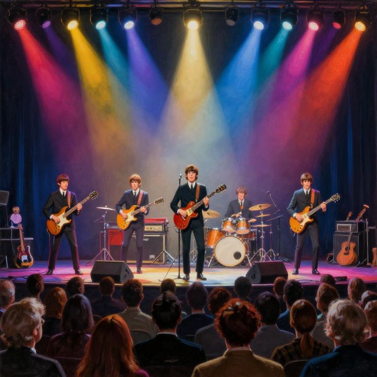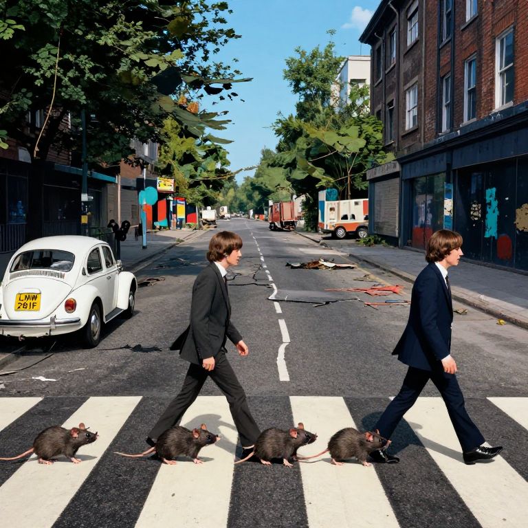 Classic album cover reenactment amongst urban decline of abandoned high-street, long shot of four rats on zebra crossing walking, overgrown cracked road intersection, at left side of road is a white Volkswagen Beetle, rear yellow registration plate reads \"LMW 281F\", peeling plaster painted cracked brick black white red cyan blue abstract over rats, fab four walking to right-hand side