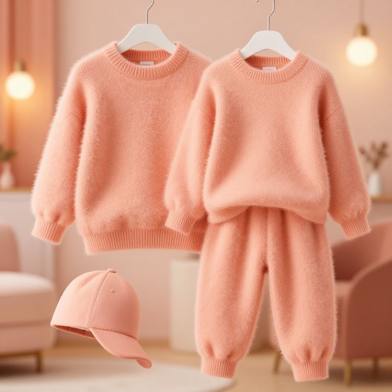 Photograph of two peach-colored, fuzzy knit sweaters on white hangers, side by side. One is a long-sleeved top, the other is a matching pants set with a slightly gathered waist. Below the hangers, a peach-colored baseball cap is suspended. The background is a soft, warm-toned room with blurred pink furniture and hanging lights, creating a cozy, pastel ambiance. The textures of the knit sweaters are prominently fluffy and inviting.