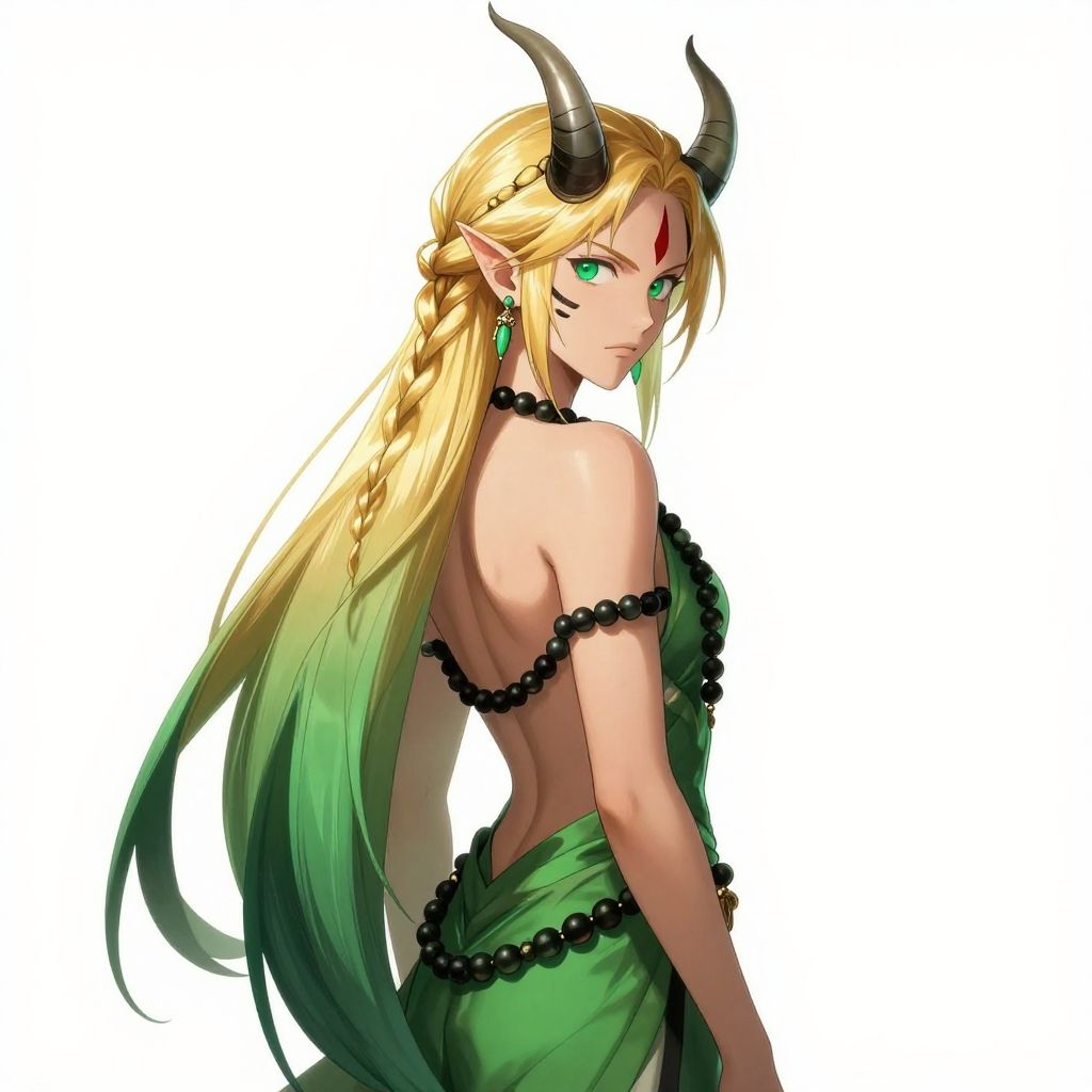 Best quality, masterpiece, by reiko, full body, character illustration, highres, best lighting and shadow, stunning color scheme, solo, horns, braid, forehead mark, jewelry, white background, long hair, pointy ears, bead necklace, beads, simple background, necklace, oni horns, looking at viewer, bare shoulders, looking back, facial mark, oni, 1girl, off shoulder, from behind, blonde hair, green eyes, earrings, braided ponytail, very long hair, prayer beads, closed mouth, green hair, sleeveless