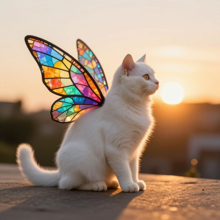 A whimsical digital artwork depicts a serene white cat adorned with vibrant, stained-glass wings that shimmer with prismatic hues, casting surreal shadows as it gazes toward a golden sunset, evoking a dreamlike, surrealistic ambiance.