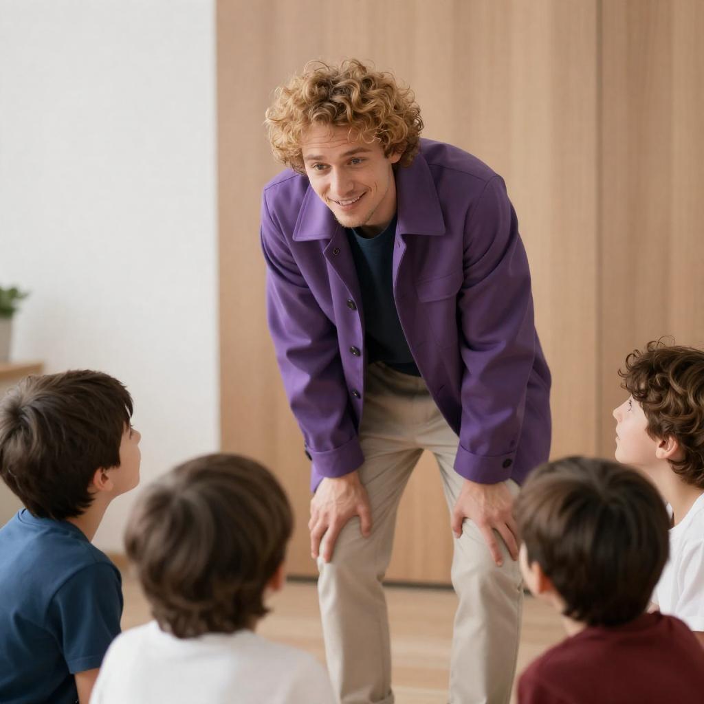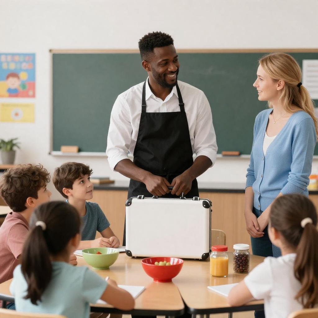 Photograph of a classroom scene. Black male teacher with short hair, white shirt, black apron, hands a white suitcase to blonde female teacher with blue cardigan. Students, mixed genders, observe. Table with bowls, jars, and kitchen items. Chalkboard and posters in background. Teacher smiles, students curious.