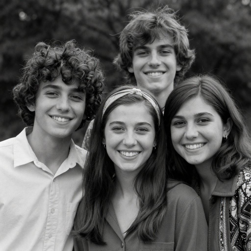 Black-and-white photograph of four smiling friends with curly and straight hair, standing closely together outdoors. The person on the left wears a light shirt, the center person has a headband, the person on the right wears a patterned jacket, and the person behind them has messy hair. A tree is in the background.