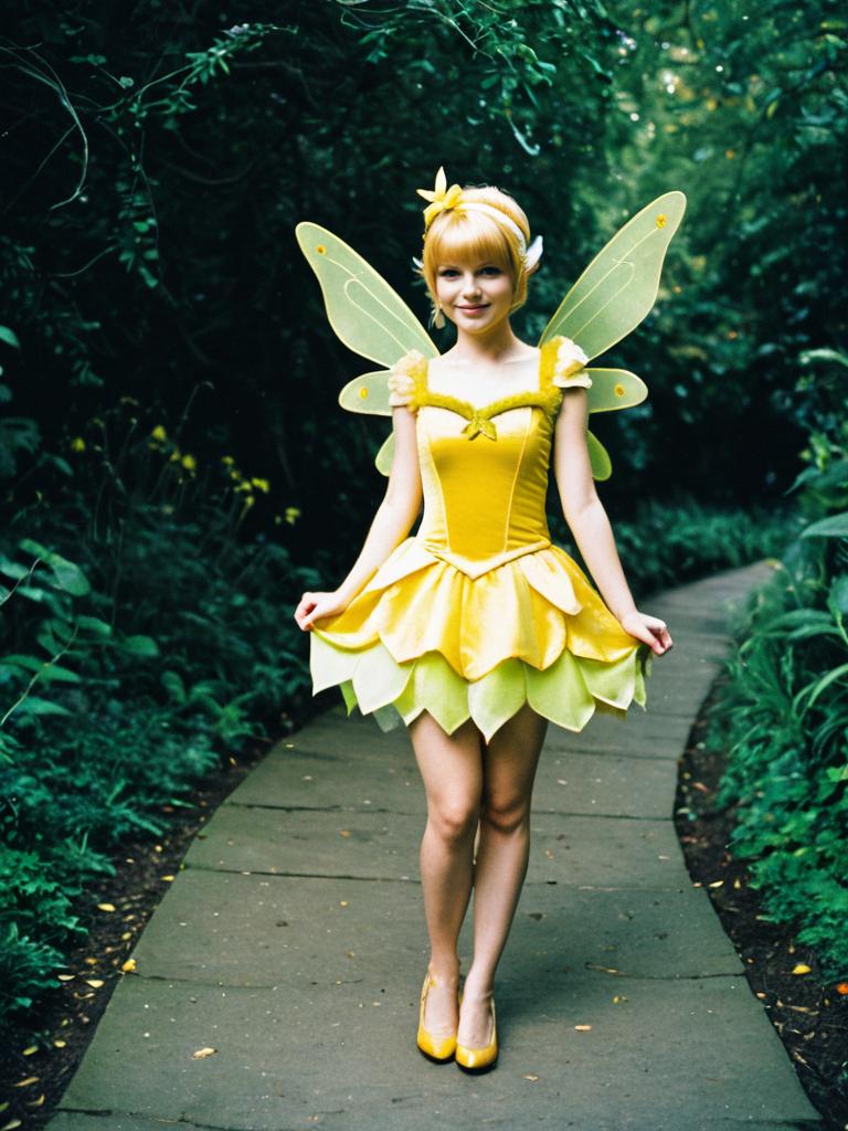 Tinkerbell Fancy Dress Costume, dressed in a yellow fairy costume standing on a path