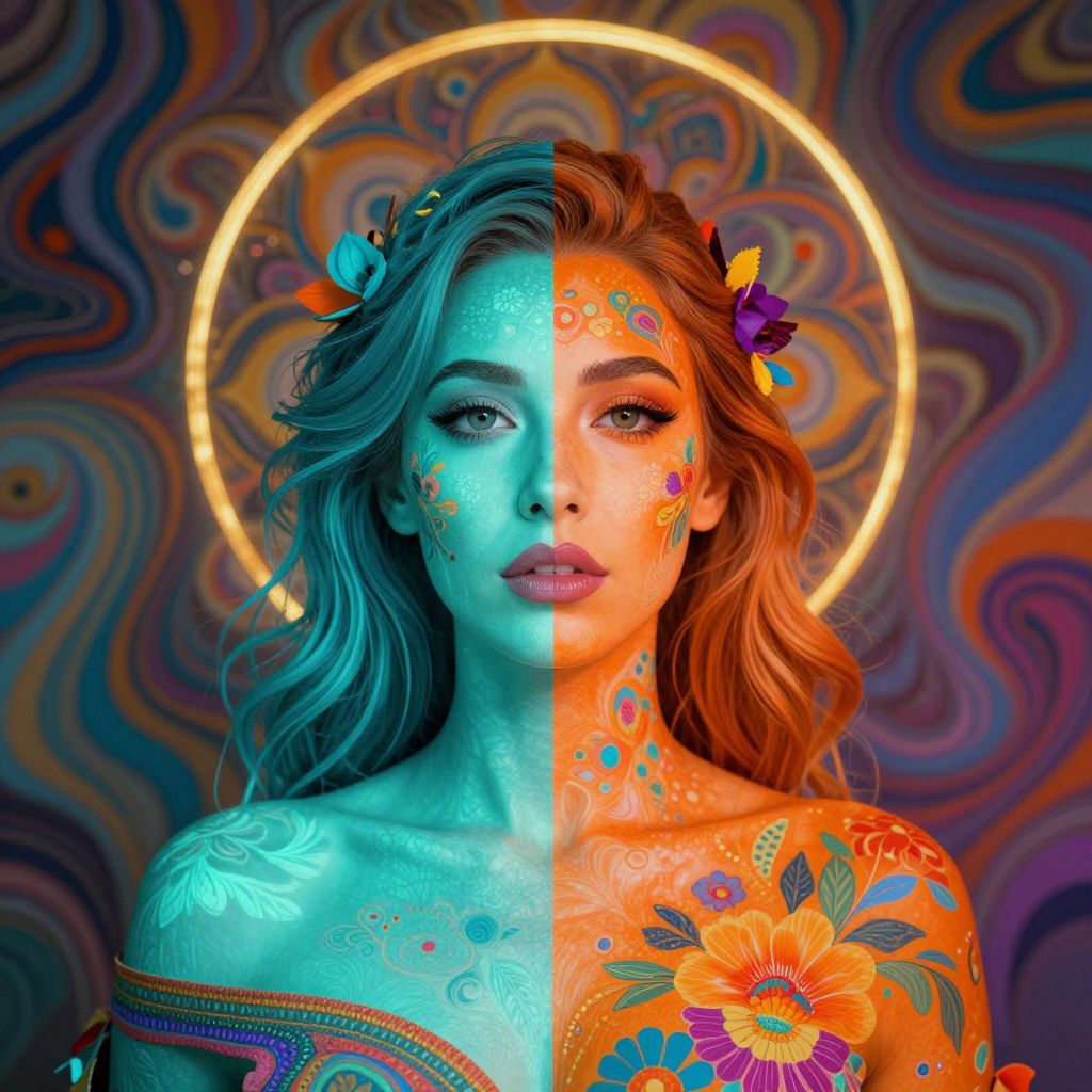 A vividly hued portrait of a woman with a split face, where her left side glows turquoise and her right side radiates orange, adorned with a kaleidoscope of floral patterns and surrounded by a golden halo against a swirling backdrop of abstract, dreamlike designs.