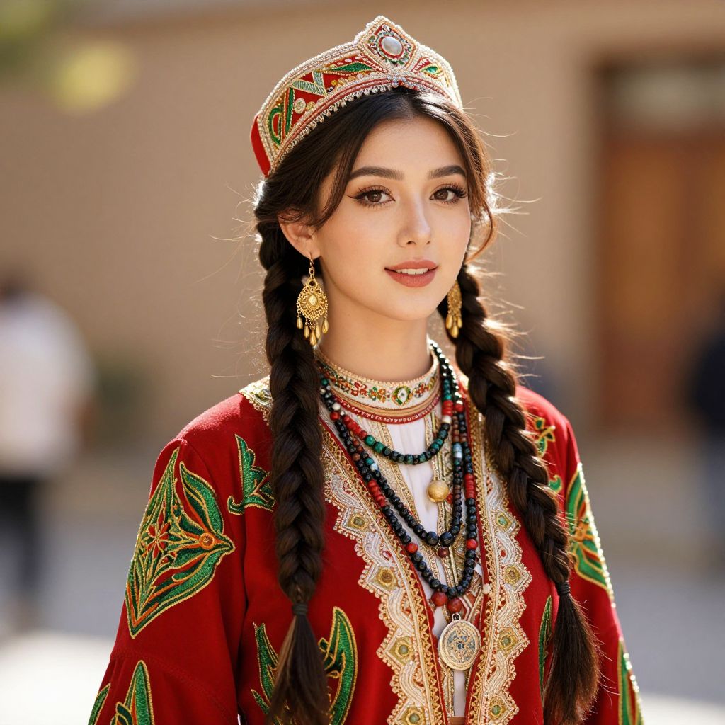 Photograph of a young woman with fair skin and dark brown braided hair, wearing a red traditional dress adorned with gold and green embroidery. She has a delicate face with brown eyes and full lips, and is wearing a jeweled crown, large gold earrings, multiple layered necklaces, and a circular pendant. The background is blurred, featuring a beige building and a person in white. The lighting is bright, highlighting her intricate attire. The overall style is traditional and ornate, with a focus on cultural elegance.