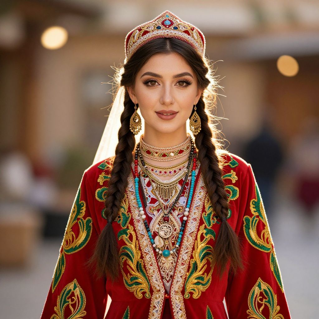 Radiant Armenian woman adorned in vibrant traditional attire, featuring a richly embroidered red dress with intricate gold and green patterns, complemented by a matching headpiece and braided hairstyle, accessorized with dangling earrings and a beaded necklace, set against a softly lit, bokeh-filled background.