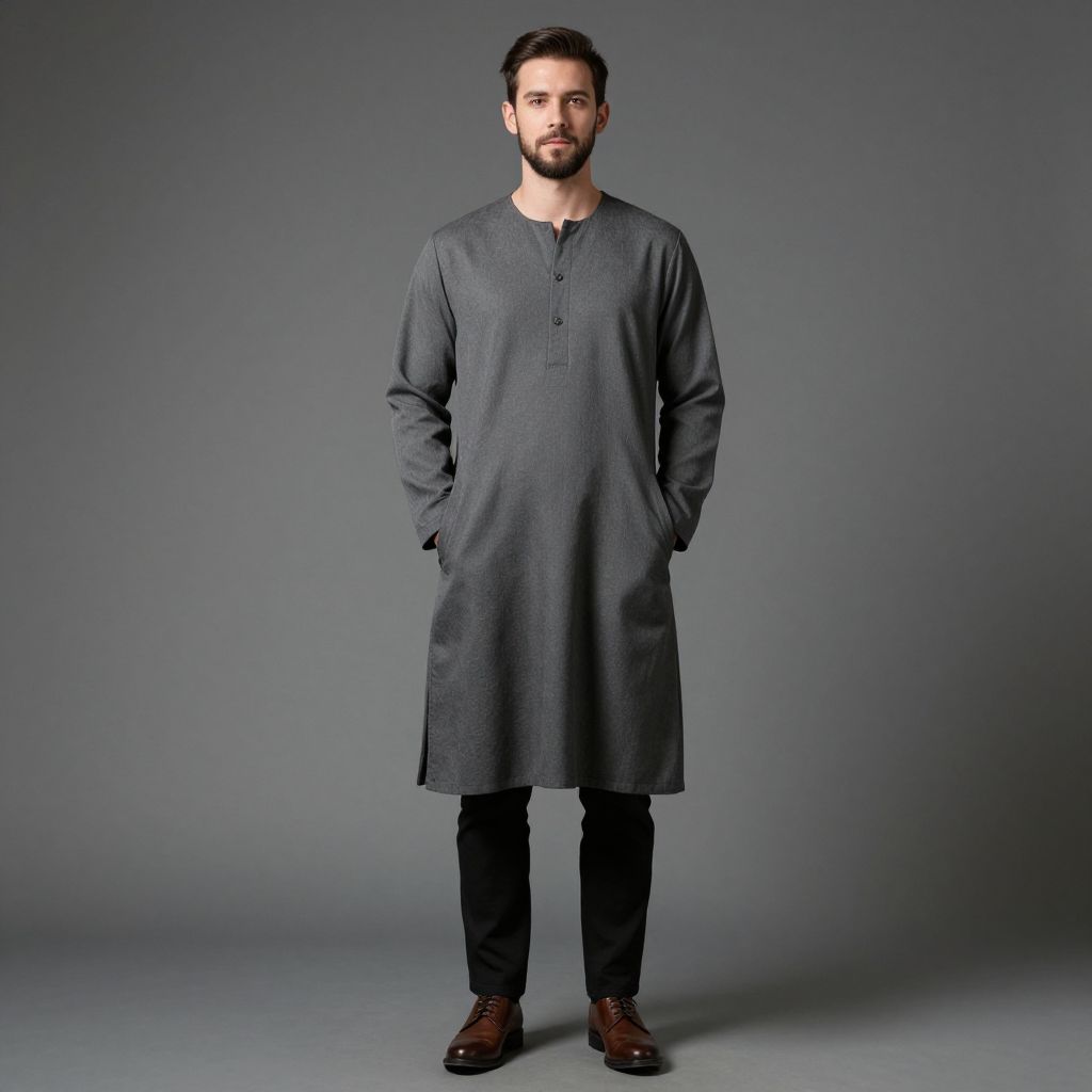 Ords male dress, 1boy, solo, male focus, facial hair, beard, brown footwear, full body, standing, grey background, shoes, hands in pockets