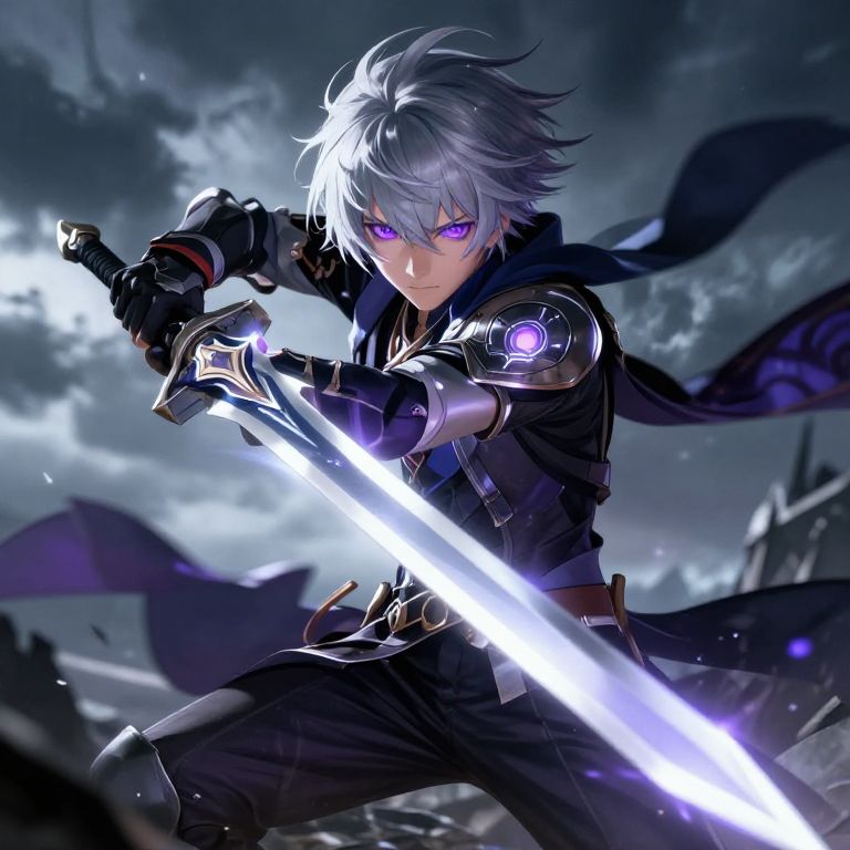 Digital anime-style illustration of a fierce, silver-haired male warrior with intense purple eyes, wielding a glowing, blue-white sword. He wears black, armored clothing with purple accents and a flowing dark cape. His left hand grips the hilt while his right arm is raised, ready for battle. The background is a stormy, dark sky with silhouetted ruins, creating a dramatic, action-packed atmosphere. His expression is determined and focused, highlighting the intensity of the scene. The image uses vibrant colors and sharp contrasts to enhance the dynamic and dramatic feel.