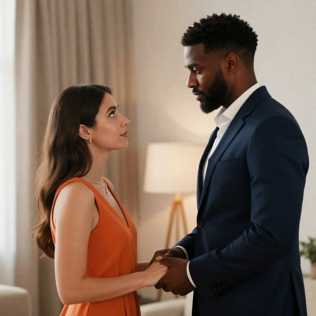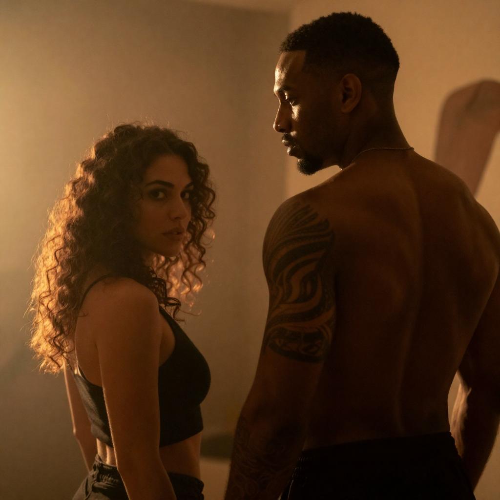 Photograph of a muscular Black man with dark skin and a bandage on his right arm, wearing tan pants, standing next to a white woman with long brown hair, wearing a white dress with a deep neckline. Background includes white-paneled doors and a metallic object. Man's expression is serious, woman's expression is neutral. Both standing indoors.
