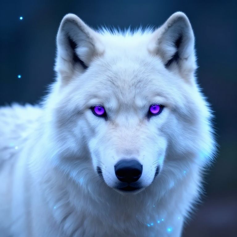 Digital artwork of a glowing white wolf with vivid purple eyes, set against a dark, starry background. The wolf's fur appears soft and textured,