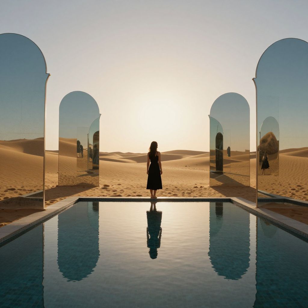 Woman standing by a reflective pool in a vast desert, framed by arch-shaped mirrors that distort reality and hint at future joy, as her silhouette merges with the golden sands and distant horizons.