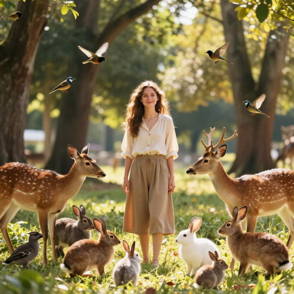 Surrounded by animals in a lush forest clearing, a serene young woman smiles as birds, deer, and rabbits gather around her under dappled sunlight, photorealistic style.