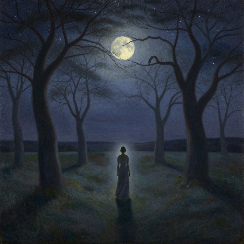 Digital painting of a ethereal, pale-skinned woman with a translucent white veil, holding a bright, glowing orb in a dark, mystical landscape with