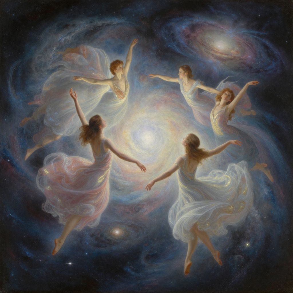 This digital painting depicts a ethereal, fair-skinned woman with a delicate, slender physique, standing in a dark, mysterious landscape. She is nude, covered by a translucent, flowing white veil that drapes over her body, accentuating her gentle curves. She gazes downward at a bright, glowing white orb she holds in her hands, which emits a radiant light. Her hair is dark and pulled back, contrasting with the luminous veil. The background is a blend of dark blues and purples, with faint, indistinct shapes suggesting a rocky terrain. The overall mood is mystical and otherworldly, with a focus on light and shadow.