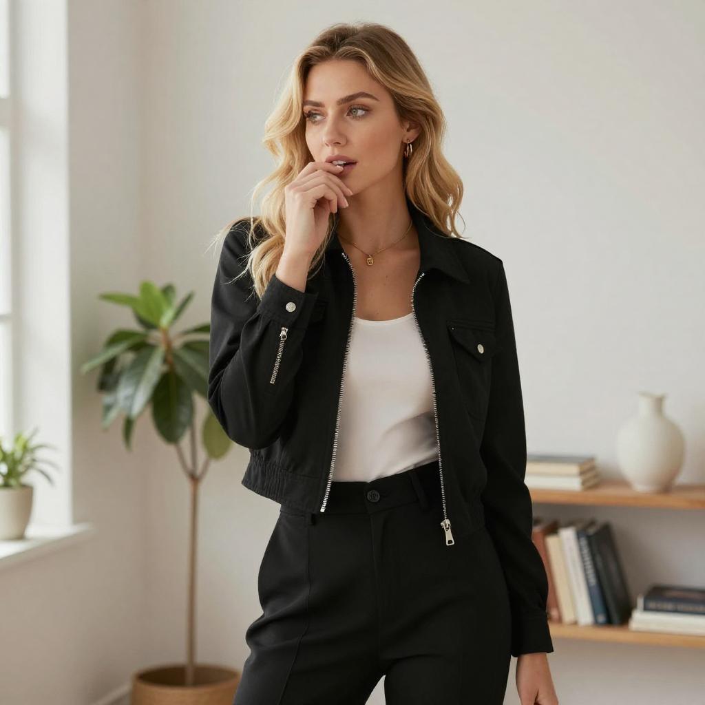 Photograph of a blonde woman with bangs, wearing a black beret and black outfit with gold buttons, reclining on a white couch. She has fair skin, full lips, and a relaxed expression, with one arm resting on her head and the other on her chest. The background is a gradient of gray to white.