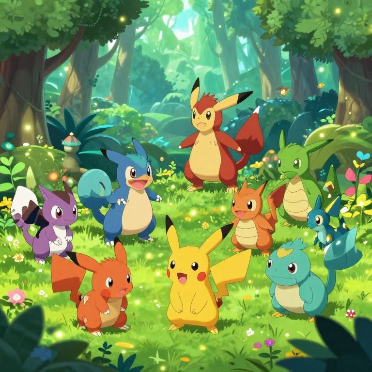 Pokemones creatures gathered in a vibrant forest clearing, colorful and diverse designs blending fantasy and nature elements, soft glowing light filtering through lush green leaves, dynamic poses capturing their playful and adventurous spirits, digital art style.