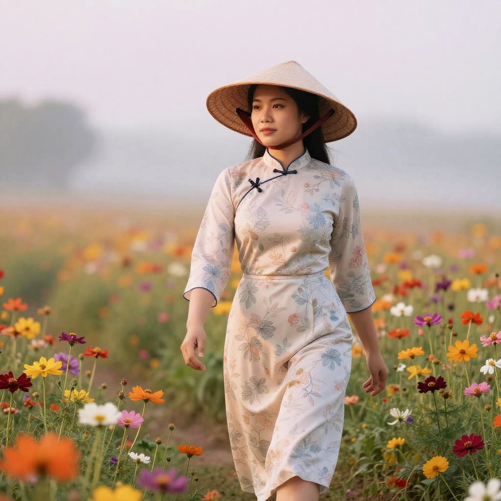 Busty Vietnamese woman in a traditional conical hat (non la) walking through a colorful flower field, morning mist, soft pastel sky, delicate floral patterns on dress, serene expression, high detail, painterly effect