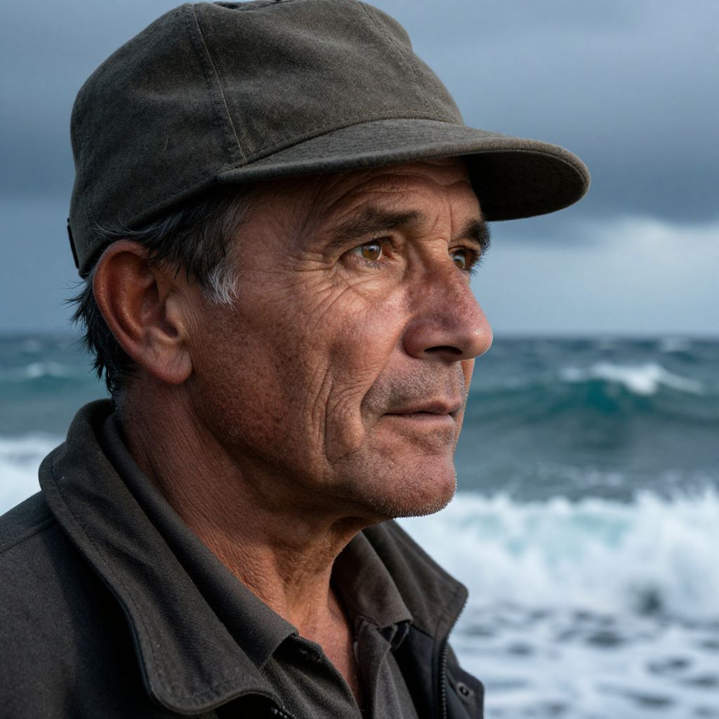 A close-up portrait showcases a weathered fisherman with intense, insightful eyes gazing towards the horizon beneath his tattered hat. The vivid backdrop of a stormy sea, with its crashing waves, frames this hyperrealistic image. It captures both the sailor's rugged strength and contemplative solitude, evoking emotions ranging from resilience to introspection as he ponders the vast, unpredictable ocean before him. Illuminated by the light, his well-traveled skin reveals every line and wrinkle of a life at sea, while the rough texture of his clothes hints at countless battles against wind and rain.