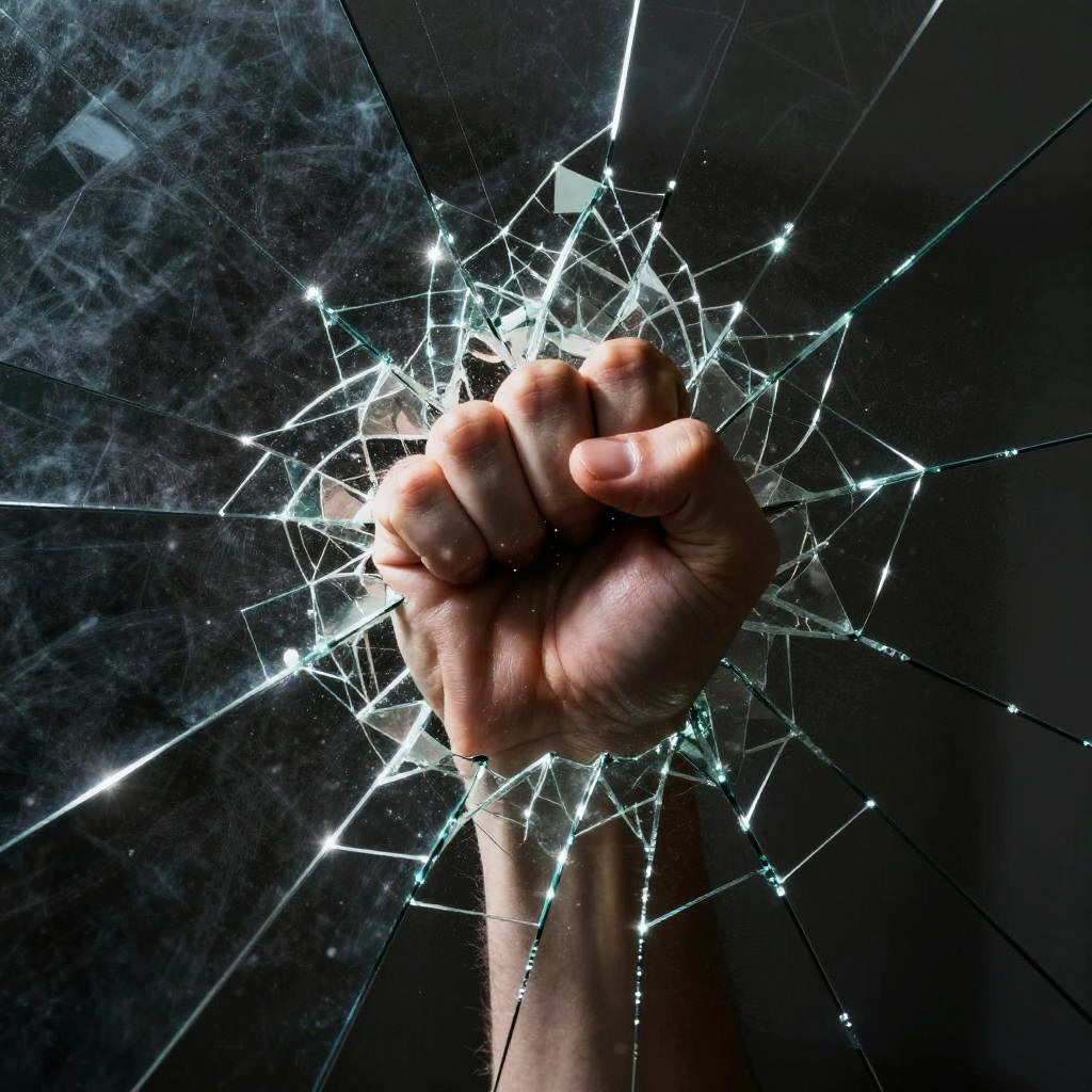 Broken glass bottle art scene, scattered fragments on a surface, artist’s tools nearby, mid-creation process, vibrant colors refracted through the glass, highlighting the artistic transformation of destruction into creativity