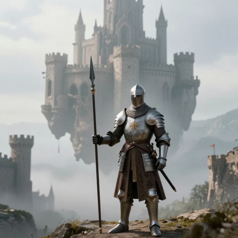 A medieval knight clad in ornate armor stands resolute, wielding a spear against a backdrop of a colossal, floating castle suspended in a misty, ethereal landscape where gravity defies convention.