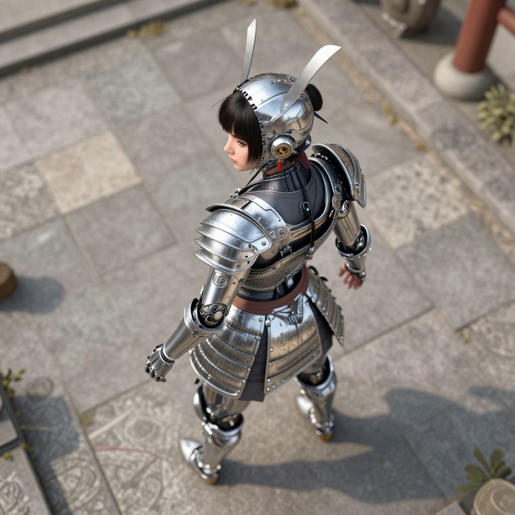 3D digital art of a child in shiny silver samurai armor with rabbit ears, standing on a stone pavement.