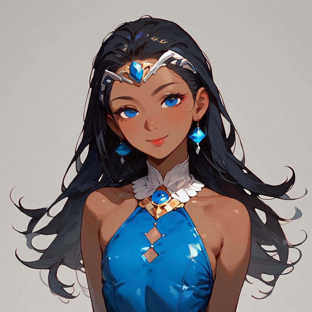 Score_9, score_8_up, score_7_up, source_anime 1girl, solo, 1girl, long hair, breasts, smile, bangs, black hair, navel, bare shoulders, jewelry, earrings, midriff, dark skin, blunt bangs, bracelet, dark-skinned female, lips, crop top, hand on hip, strapless, makeup, pelvic curtain, tube top, loincloth cowboy shot