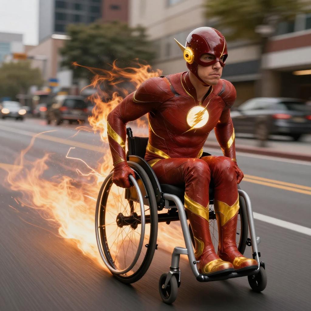 Barry allen the flash on wheelchair moving at supersonic speed creating flame trails, speed trails, motion blur, electricity speed outdoor, realistic highly detailed cinematic cinematography, movie shots footage