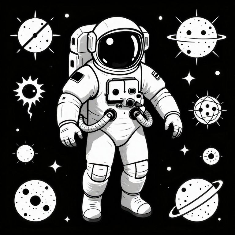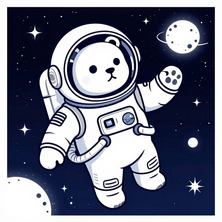 Pink bear character astronaut floating in space with stars and planets in the background, futuristic style, vibrant pink hues contrasting with dark cosmos, sci-fi illustration