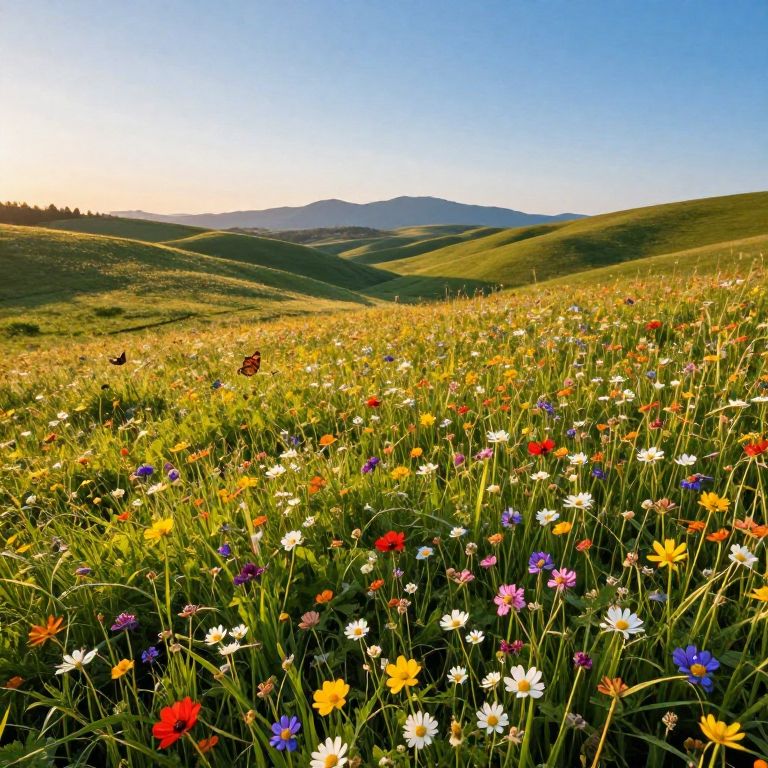Natura wildflower meadow in springtime, colorful blooms carpeting rolling hills, butterflies fluttering among flowers, distant mountains under a clear blue sky, warm golden hour lighting, wide scenic vista, photorealistic and richly detailed flora