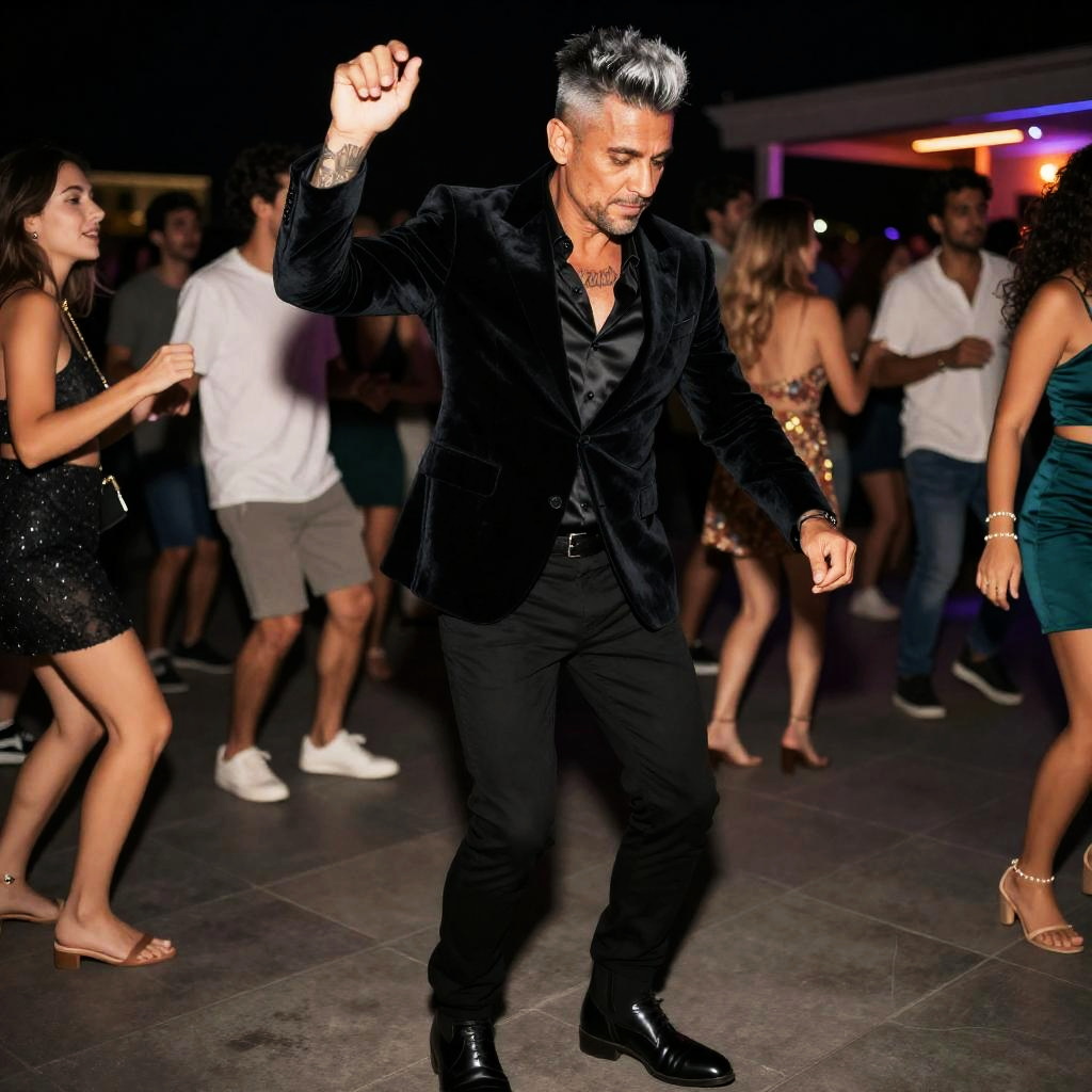 A 45-year-old man with a salt-and-pepper pompadour and full sleeve tattoos, wearing a tailored velvet blazer, silk open-collar shirt, slim tapered trousers and polished leather boots, dancing at a lively rooftop party, surrounded by colorful lights, highly detailed, 8k resolution, sharp, professional, clear, high contrast, high saturated, vivid deep blacks, crystal clear.